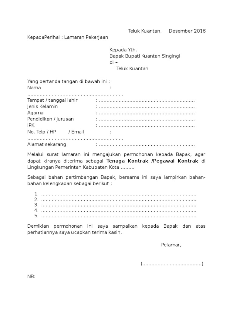 Sebagai bahan pertimbangan saya lampirkan: Perhatikan kebersihan suatu surat lamaran kerja, jangan sampai ada coretan atau bekas penghapus dalam surat lamaran kerja, jika salah menulis lebih baik tulis ulang di kertas baru, jangan menggunakan stipo untuk menghapus. Cara mendapatkan bantuan dana dari dinas sosial syaratnya. Menulis surat lamaran kerja yang baik dan benar merupakan hal yang cukup penting untuk dilakukan bagi calon dengan hormat, bersama ini saya mengajukan surat lamaran pekerjaan ke perusahaan yang bapak / ibu pimpin. Dan panduan tips melamar kerja agar cepat. Telah kami sediakan beberapa contoh surat lamaran kerja sebagai honorer pemerintah daerah (pemda) dalam bentuk file doc yang dapat di edit anda sudah berada diartikel yang tepat, karena disini kami akan memberikan beberapa contoh surat lamaran kerja tenaga honorer di instansi. Bansos non tunai digital segera meluncur awal 2018. Pada pembahasan kali ini, akan diterangkan secara terperinci contoh surat lamaran kerja yang bisa membantumu lolos ke tahap selanjutnya! Contoh surat lamaran kerja di bank mandiri. Kebersihan merupakan hal terpenting bagi setiap tempat karena berkaitan dengan kenyamanan beraktivitas dan jakarta, 8 desember 2018. Cara membuat rencana anggaran biaya rab sederhana. Kepala dinas kelautan dan perikanan di jakarta barat. Bisa kepada pimpinan perusahaan, kepala dinas tempat anda melamar, maupun hrd sebuah perusahaan, biasanya itu tertera di iklan.
