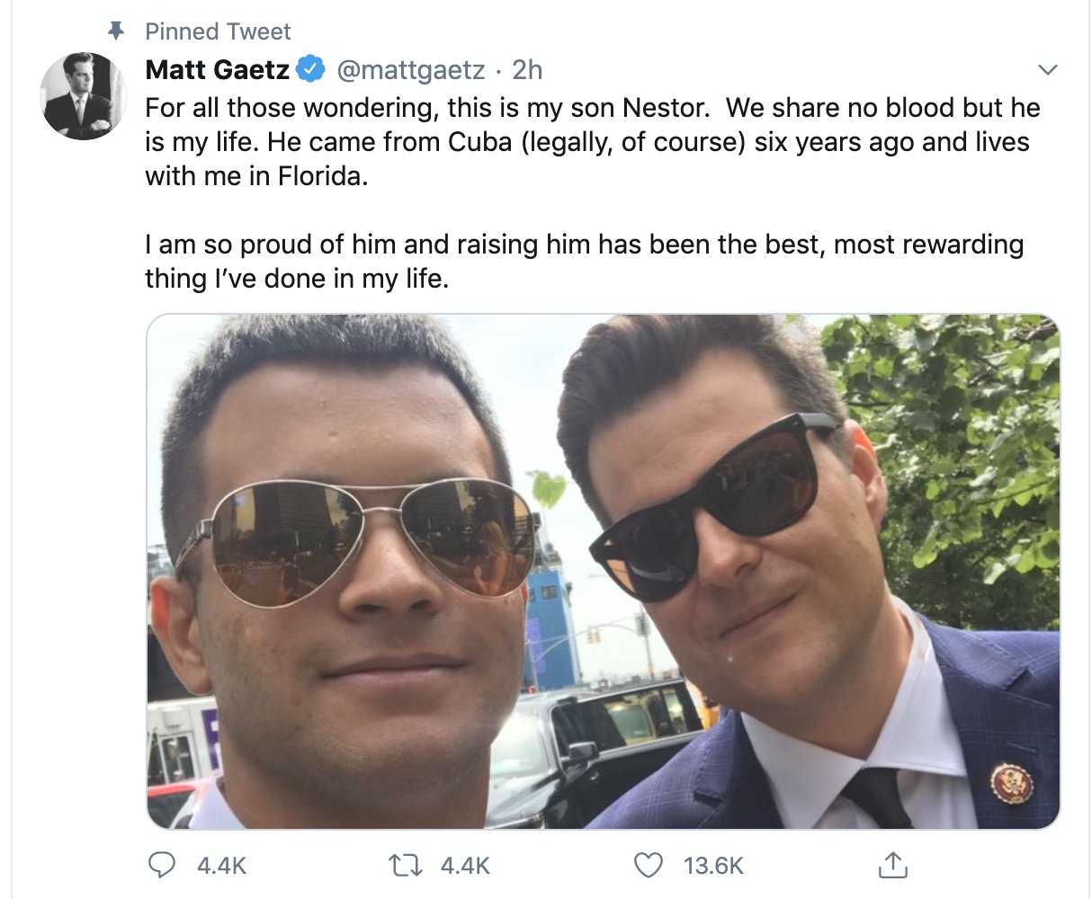 Matt revealed that nestor has lived with him for around four years. From the college of william & mary law. Congressman matt gaetz refers to nestor galban, a young college student, as his son, despite the fact that gaetz never officially adopted him. He completes his graduated from florida state university in 2003 with a b.s. Matt gaetz and progressive former california rep. Matt told people that nestor came to the united states following the death of his mother. Matt gaetz continued a family tradition when he got involved in politics. Six years ago, florida rep. Matt gaetz has told an ohio rally he is 'being falsely accused of exchanging money for naughty favors' after his alleged wingman agreed to cooperate with federal investigators in their ongoing. Six years ago, florida rep. For all those wondering, this is my son nestor, gaetz tweeted along with a photo. Matt gaetz says, he met the young boy he now calls his son. A few weeks ago, rep.